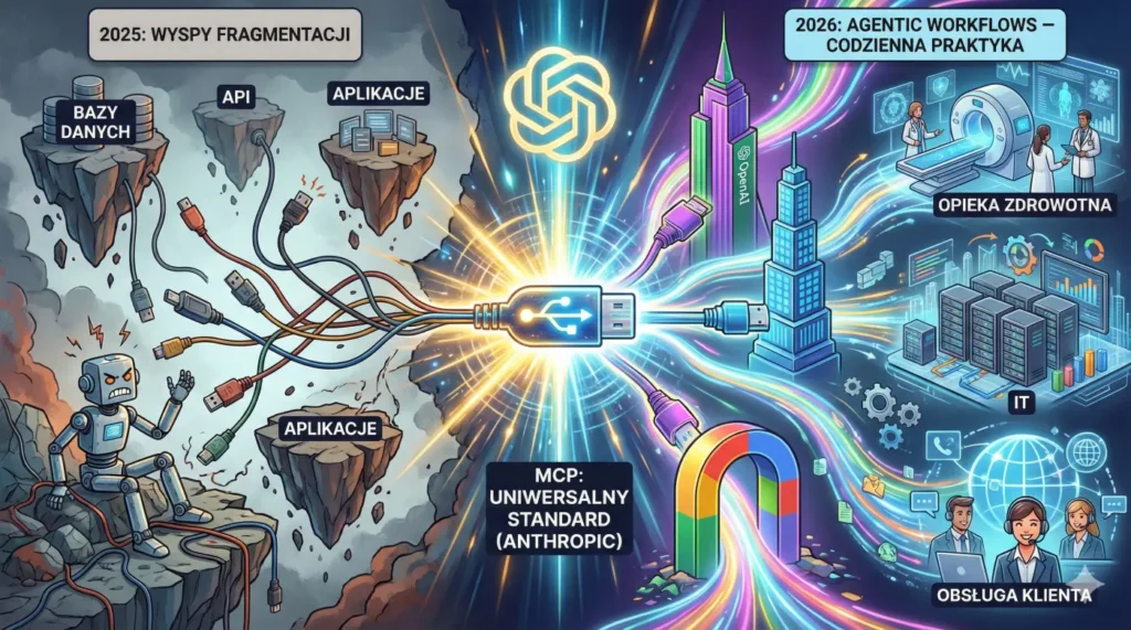 MCP działa jak „USB-C dla AI”, tworząc uniwersalny interfejs komunikacyjny dla agentów. Szybka adopcja tego standardu przez gigantów takich jak OpenAI, Microsoft i Google sprawia, że bariery technologiczne znikają. Dzięki temu w 2026 roku tzw. „agentic workflows” (przepływy pracy oparte na agentach) przechodzą z fazy demonstracji do codziennej praktyki w obszarach takich jak obsługa klienta, IT czy opieka zdrowotna, automatyzując wieloetapowe i złożone zadania.