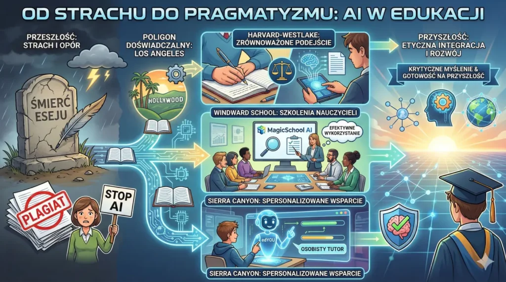 Początkowy strach przed AI w edukacji, symbolizowany przez hasła o „śmierci eseju” i masowych plagiatach, ustępuje miejsca dojrzałemu i pragmatycznemu podejściu. Prestiżowe prywatne szkoły w Los Angeles, takie jak Harvard-Westlake czy Sierra Canyon, stają się poligonem doświadczalnym dla zrównoważonej integracji AI w procesie nauczania. Kluczem nie jest zakazywanie, lecz mądre wykorzystanie narzędzi do wzmacniania nauki i przygotowania uczniów do przyszłości.