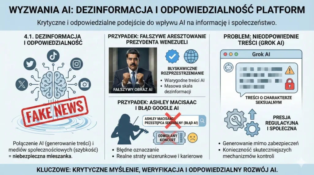 Zdolność AI do generowania wiarygodnie wyglądających treści w połączeniu z szybkością mediów społecznościowych tworzy niebezpieczną mieszankę, która może być wykorzystywana do dezinformacji na masową skalę.