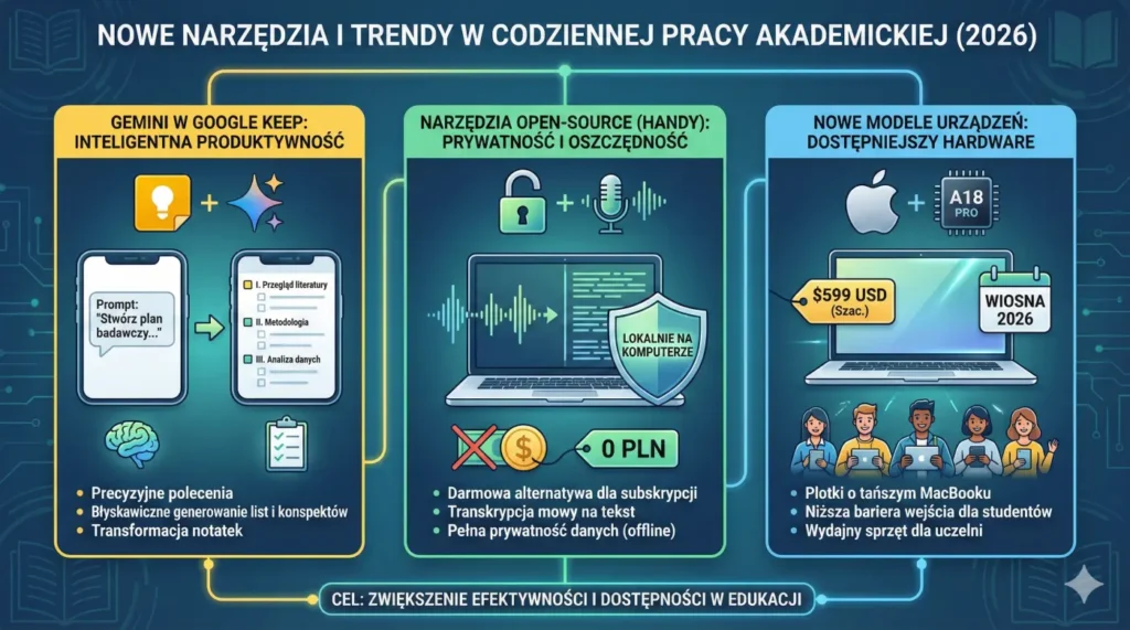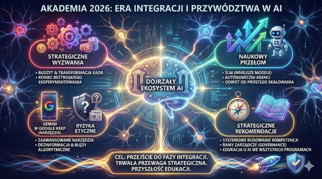 Pierwsze dni 2026 roku wyraźnie pokazują, że era beztroskiego eksperymentowania z AI dobiegła końca. Analiza kluczowych trendów z ostatniego tygodnia rysuje obraz dojrzałego, ale i wymagającego ekosystemu. Z jednej strony uczelnie mierzą się ze strategicznymi wyzwaniami w obszarze budżetu i transformacji kadr. Z drugiej, świat nauki doświadcza przełomu w badaniach, odchodząc od prostego skalowania na rzecz mniejszych, wyspecjalizowanych modeli (SLM) i autonomicznych agentów. Jednocześnie na rynek trafiają coraz bardziej zaawansowane narzędzia, takie jak Gemini w Google Keep, a narastające ryzyka etyczne, w tym dezinformacja i błędy algorytmiczne, wymagają bezprecedensowej uwagi.